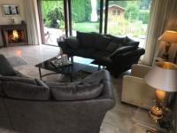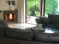 Ein weiterer offener Kamin im Wohnzimmer sorgt für natürliche Wärme und bindet die Sofalandschaft sowie den Essbereich mit Blick in die Natur ein. Dabei wirkt der Übergang zwischen drinnen und draußen wie selbstverständlich und ist durch eine Schiebetür an der großen Fensterfront zu steuern.