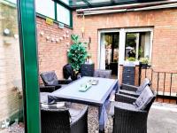 Diele, Badezimmer, Esszimmer mit offener Küche, Wohnzimmer mit Kamin, Wintergarten